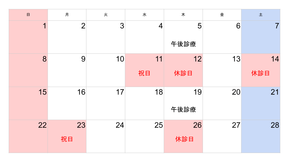 2月の診療予定 お知らせ 2026.01.20 臨時休診のお知らせ 2月14日 (土曜日)は、都合により臨時休診とさせていただきます。患者さまにはご不便をおかけいたしますが、何卒ご理解のほどよろしくお願い申し上げます。 第1,3木曜日は午後のみ診療、第2,4木曜日は休診日となっています