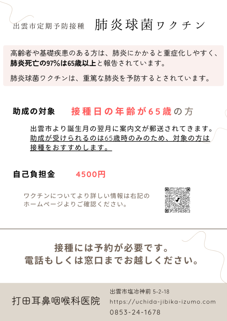 65歳の方への肺炎球菌ワクチン接種が、予防接種法に基づく定期接種の対象となっています。